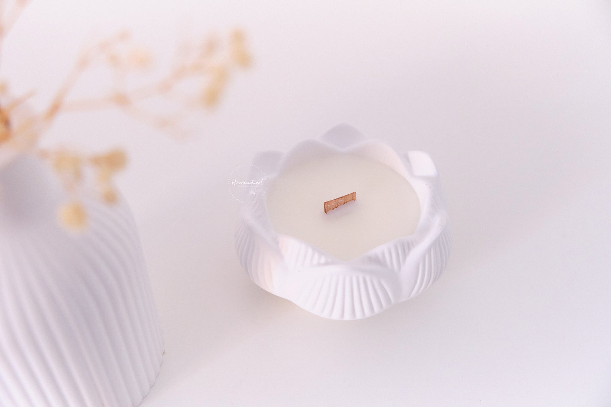 Una candela racchiusa in una delicata foglia di loto bianca simbolo di purezza e armonia, diffonde una luce morbida che invita alla calma e alla contemplazione.