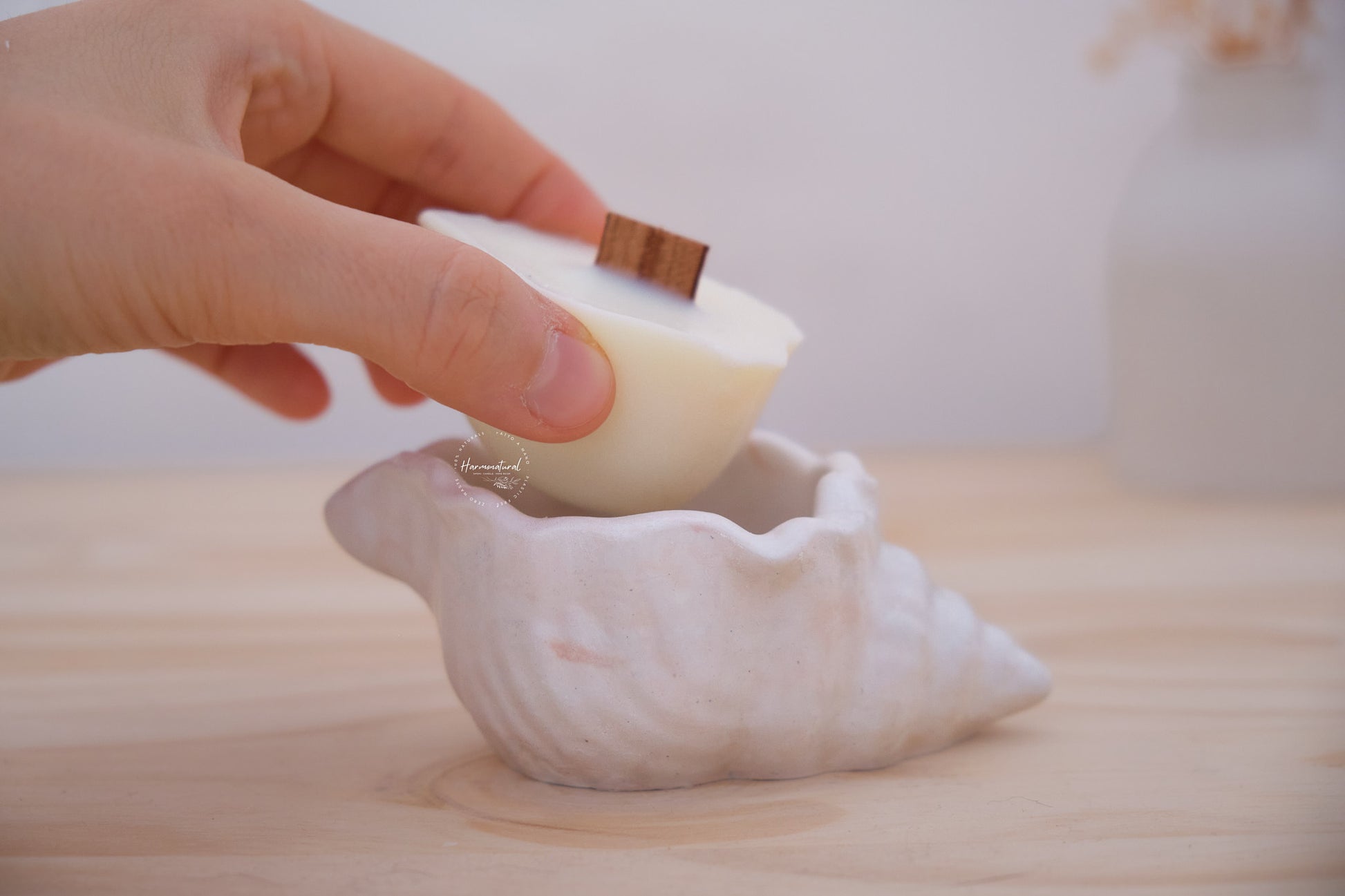 - Spegni la candela prima che la cera si sia completamente consumata (circa 5mm dal fondo). Per spegnerla usa uno spegni cera (sniffer) o il coperchio (riaprendolo subito dopo). Evita di soffiare sulla fiamma, poiché ciò può causare schizzi di cera.